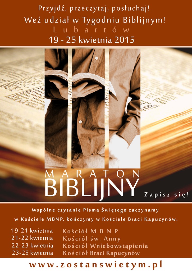Zgłoś chęć przeczytania fragmentu Biblii w wybranym kościele, a otrzymasz wskazówki na temat tego, który fragment przypadnie Ci w udziale, o której godzinie będziesz go czytał (będziesz mógł wybrać najodpowiedniejszą dla siebie porę), o której powinieneś pojawić się w Świątyni. W domu zdążysz przygotować się do czytania. Nie musisz zabierać swojego egzemplarza Pisma Świętego. Zapisy w niedzielę, 12 i 19 kwietnia, w podanych poniżej kościołach po każdej mszy.